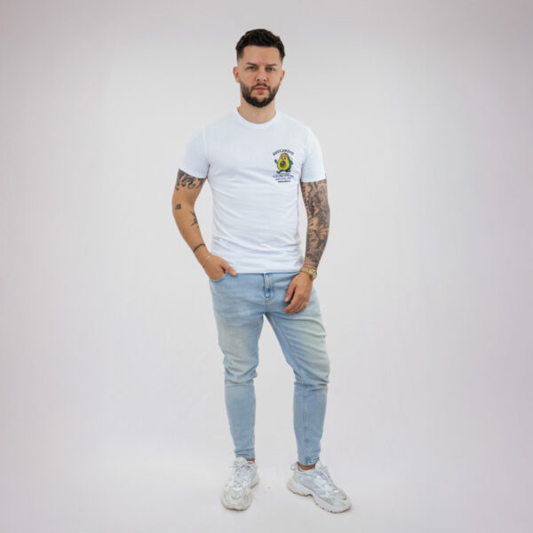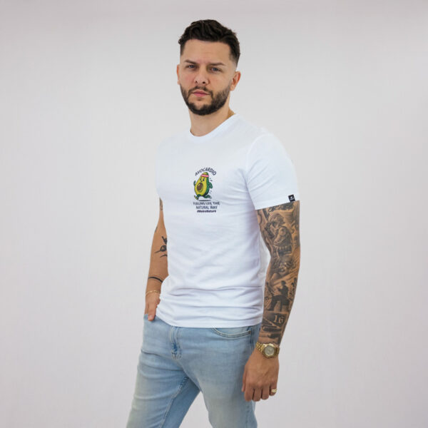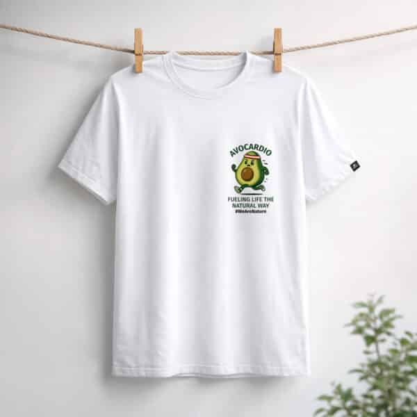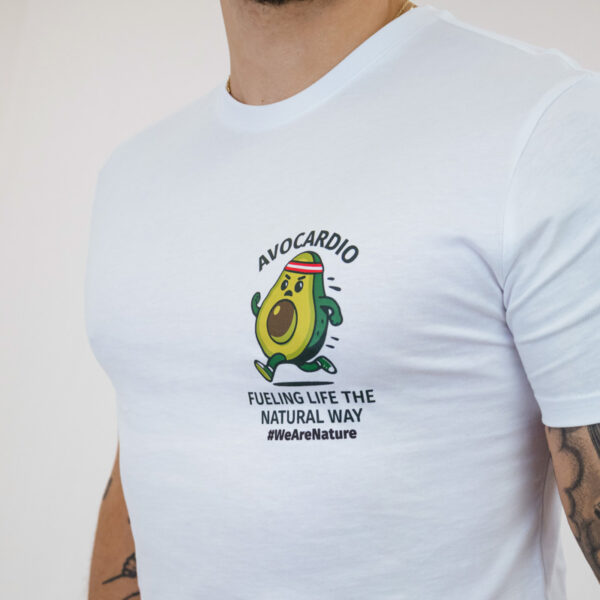 Balts T-krekls ar košu skrienoša avokado ilustrāciju un rotaļīgu tekstu “AVOCARDIO.” Ar saukli “DZĪVES UZLĀDĒŠANA DABISKĀ VEIDĀ,” šis krekls ir jautrs un motivējošs atgādinājums būt aktīvam un turpināt kustēties.