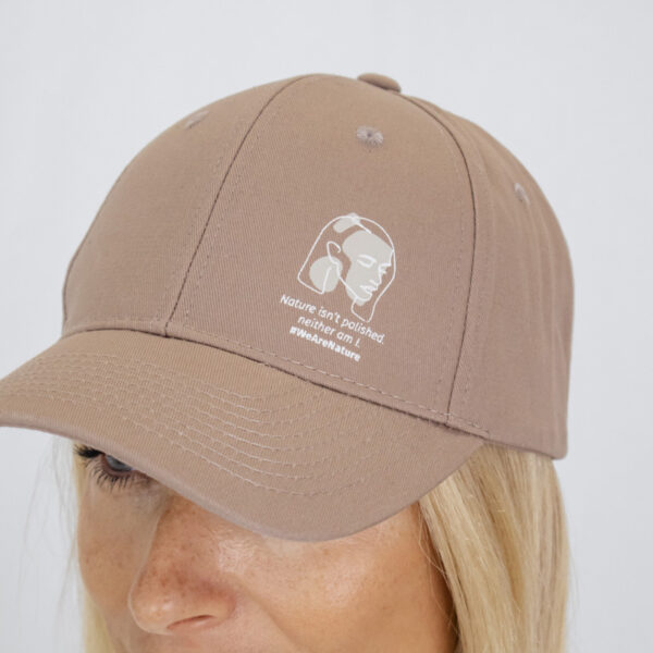 Minimālistiska brūna cepure, kas radīta vieglam ikdienas stilam. Tai ir izsmalcināta līnijmākslas grafika ar uzrakstu “Daba nav noslīpēta, un es arī nē” tīrā baltā drukā, kas izceļ autentiskumu un dabisku pārliecību.
