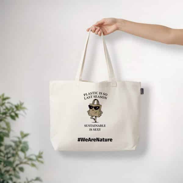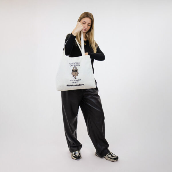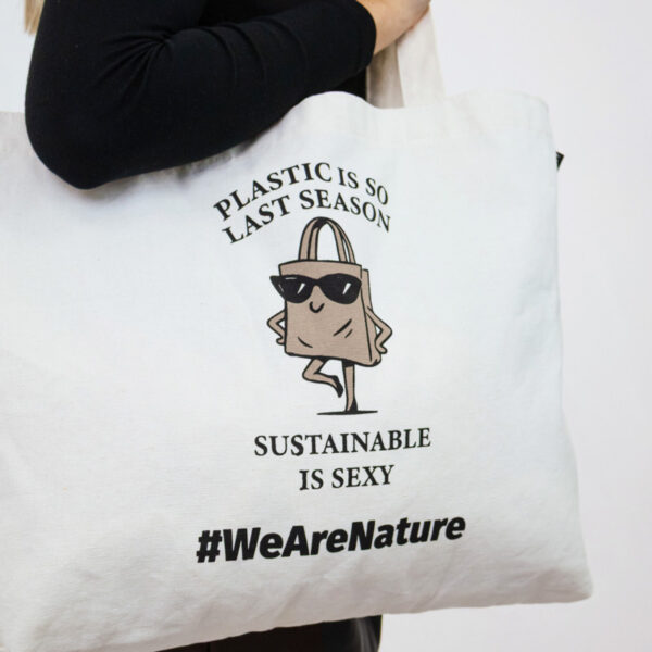 Mūžīga auduma soma, kas radīta ikdienas stilam ar ilgtspējīgu pieeju. Apdrukāta ar rotaļīgu vēstījumu “Plastmasa ir tik pagājusī sezona. Ilgtspēja ir seksīga.” un šarmantu ilustrāciju ar pašpārliecinātu iepirkumu somu saulesbrillēs, tā apzinātai ikdienai piešķir humoru un raksturu.