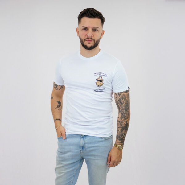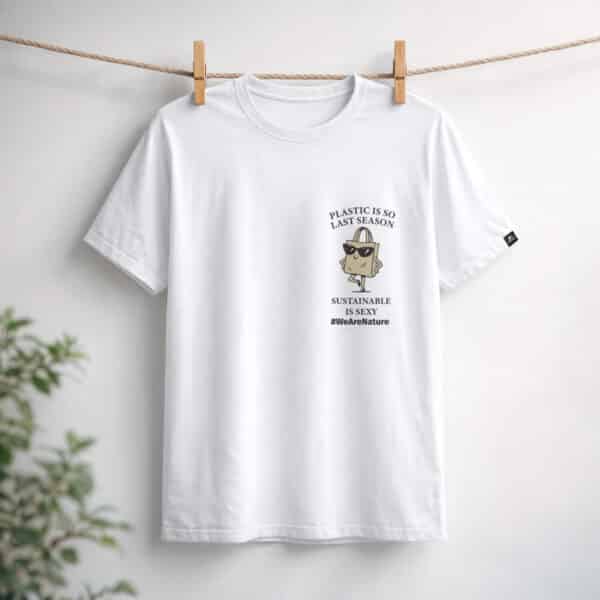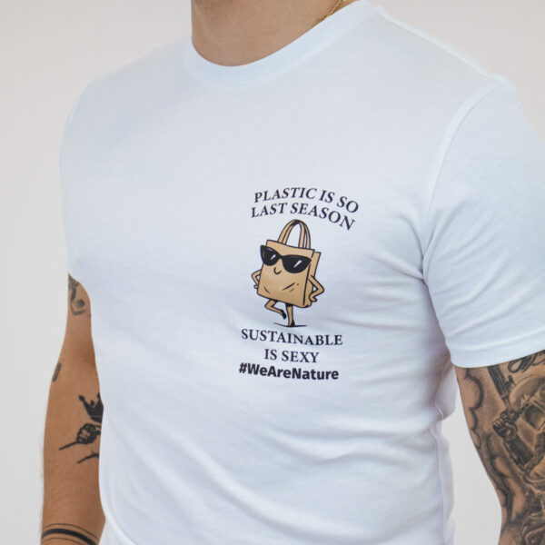 Minimālistisks balts T-krekls, kas apvieno stilu ar mērķi. Ar drosmīgo uzrakstu “Plastmasa ir tik pagājušā sezona. Ilgtspēja ir seksīga.” izteiksmīgā grafikā tas piešķir jebkuram tērpam pārliecinātu un rotaļīgu akcentu.