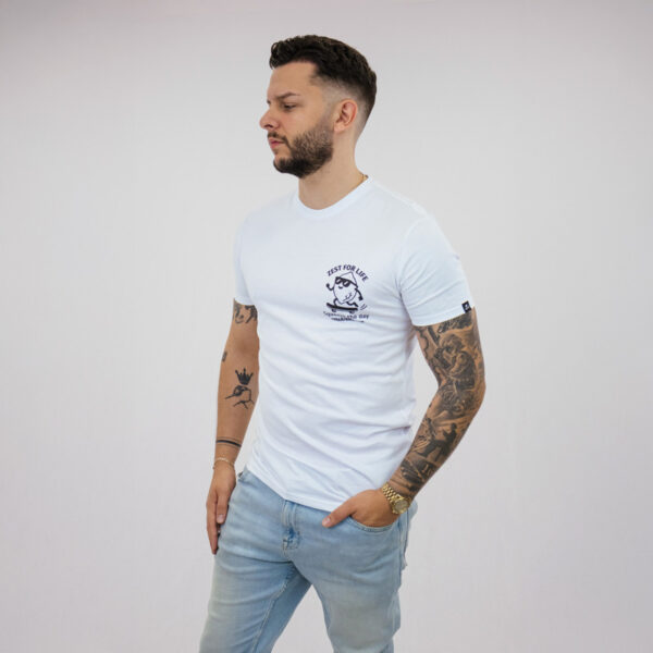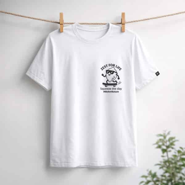 Minimālistisks balts T-krekls, radīts vieglam ikdienas stilam. Ar uzrakstu “Dzīves garša – Izspied dienu” un rotaļīgu citrona uz skrituļdēļa grafiku tas apvieno komfortu ar dzīvespriecīgu un pārliecinātu attieksmi.